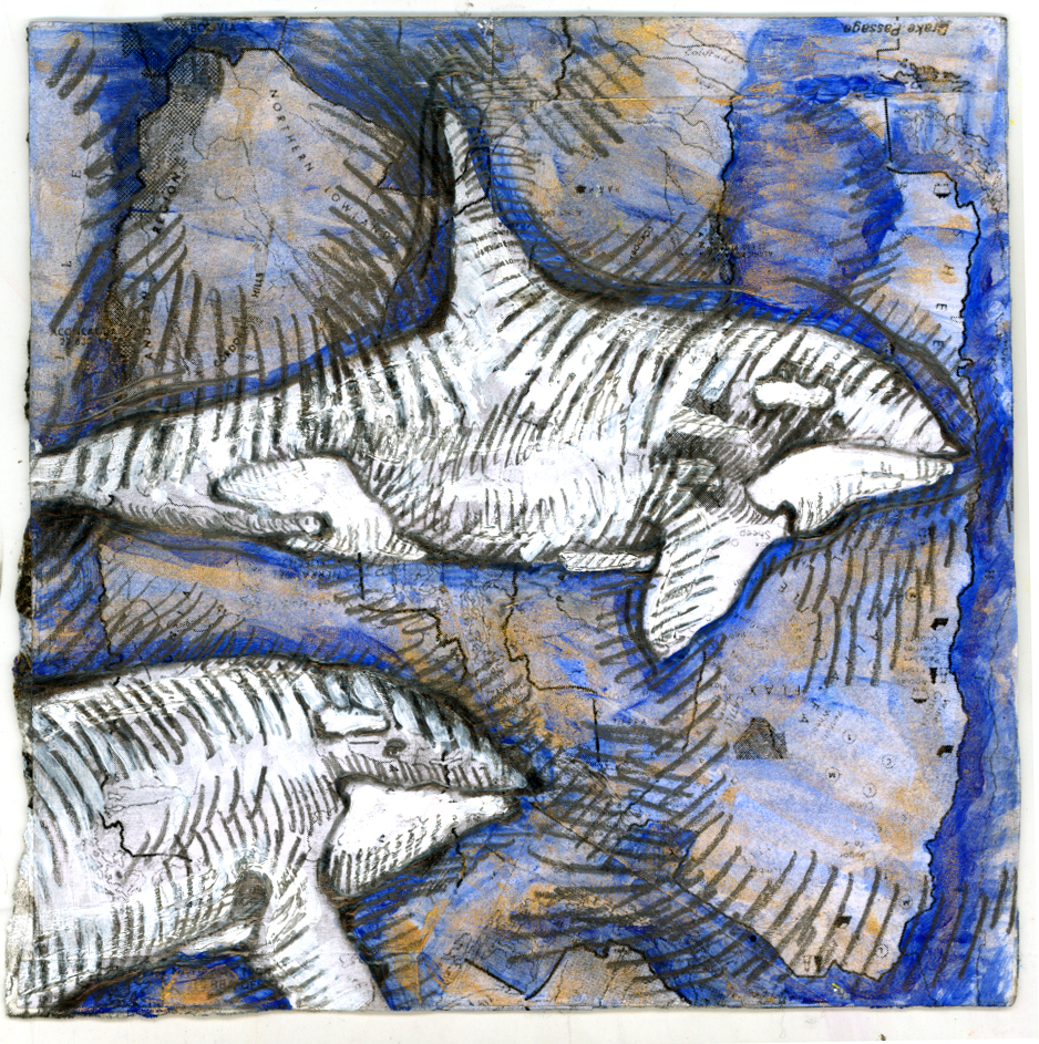 South Atlantic mixed media sketches include the use of maps and Southern South American animals in simple compositions.  The visual products of this exploration paved the way for the development of the Migrations series.