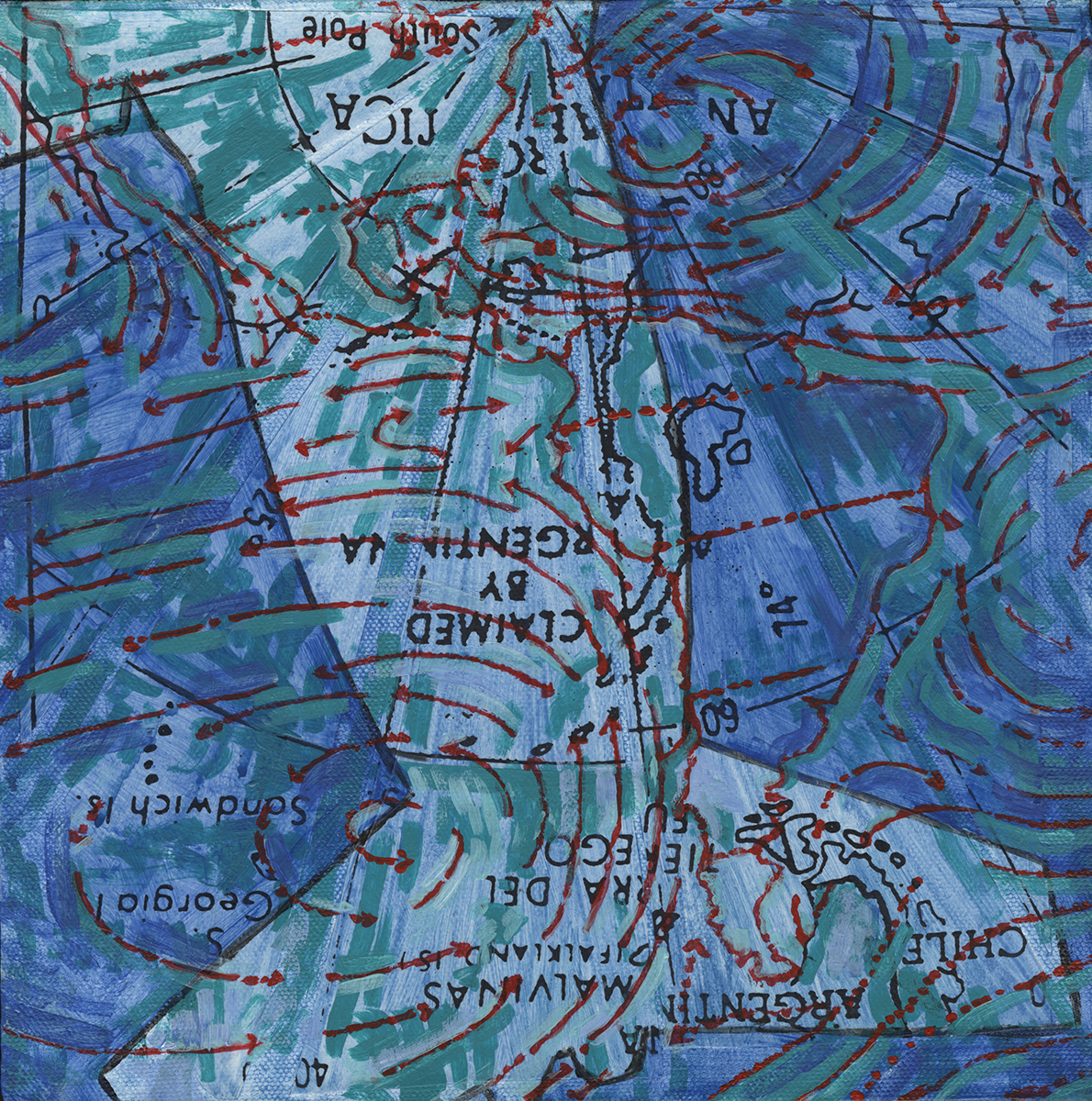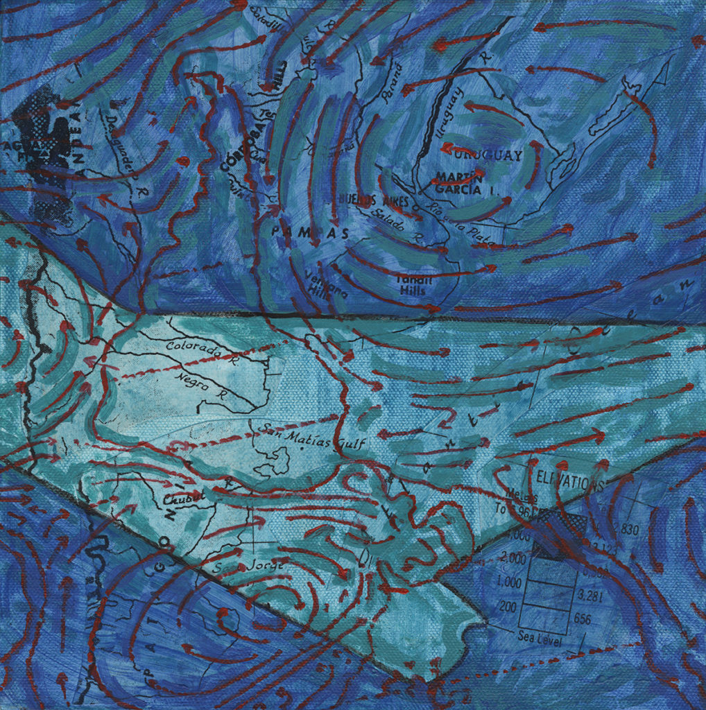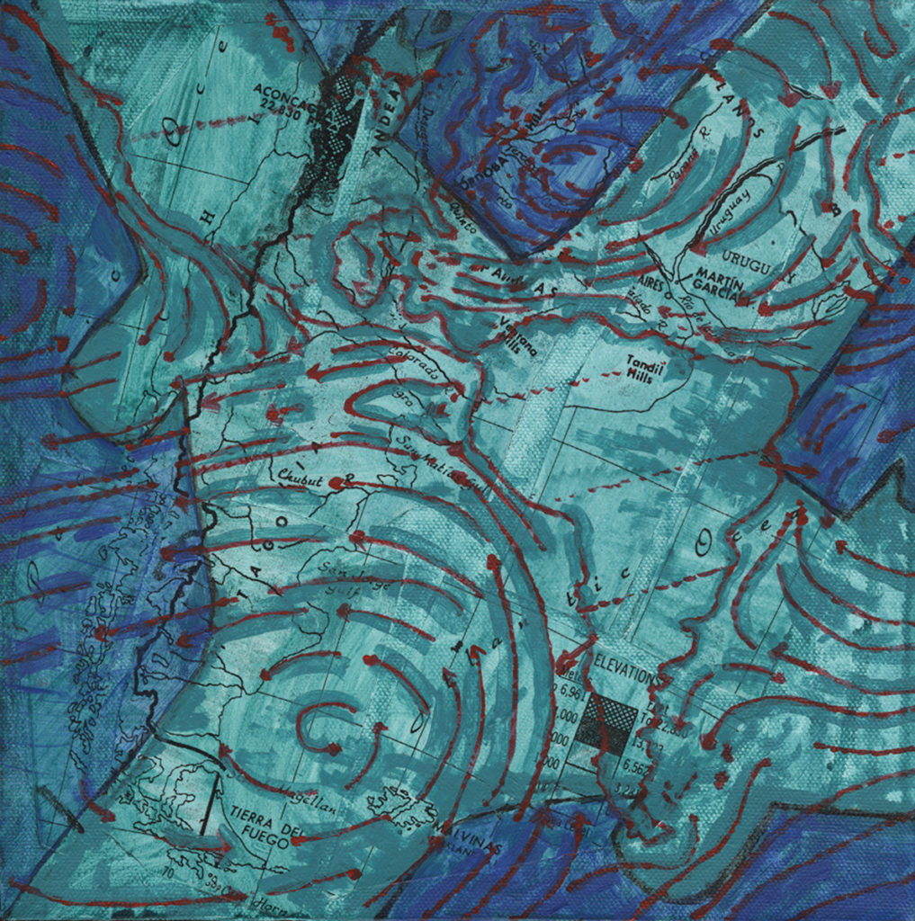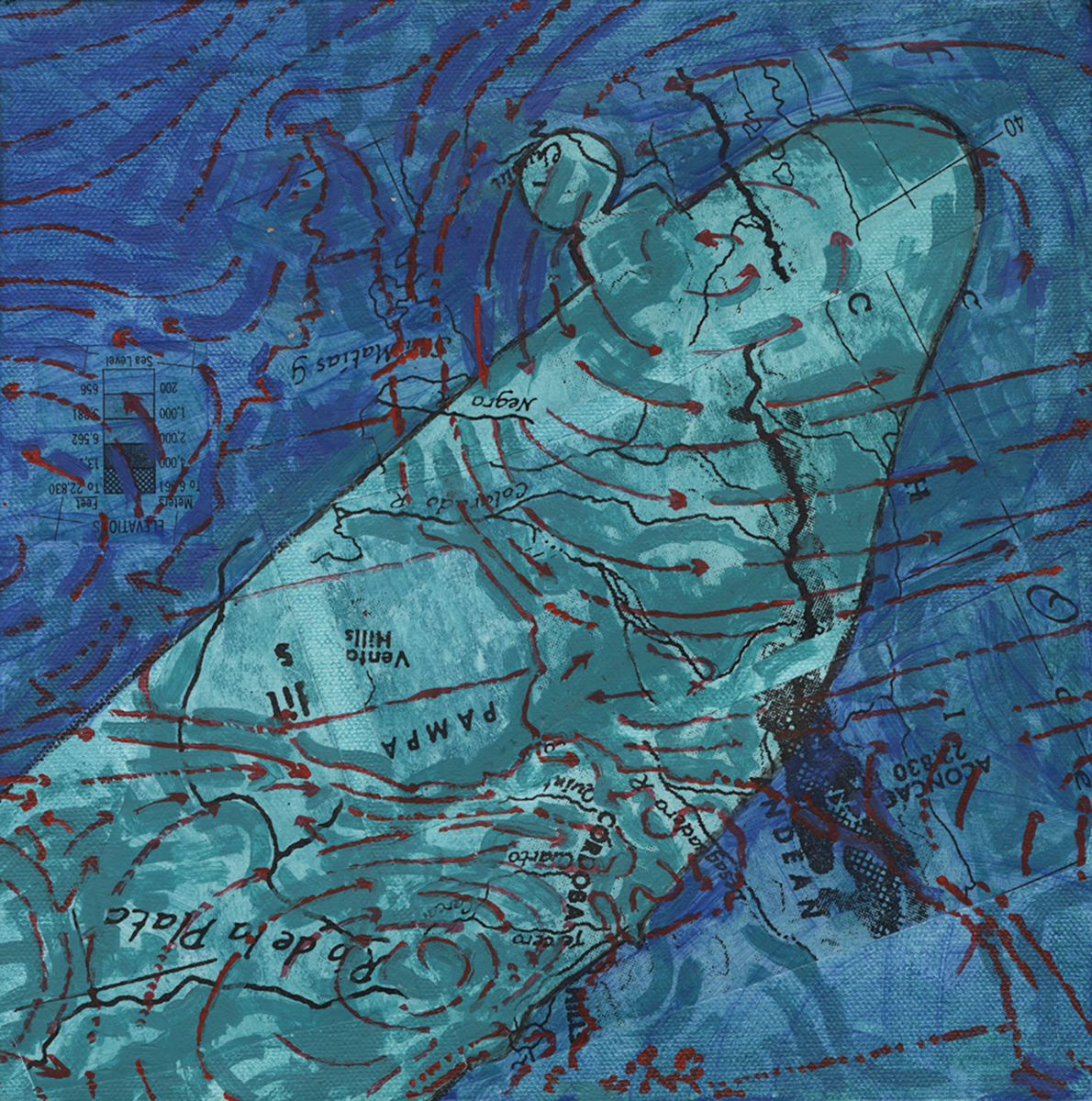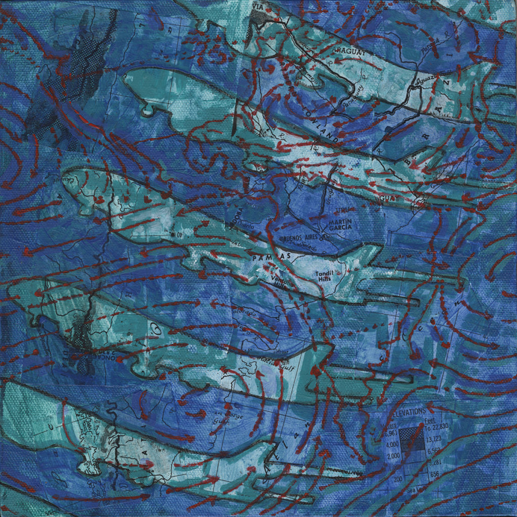 “Ponce de Leon… pulls from her international experience, musing on the disorientation travel can cause. The surfaces… are layers of collaged maps and diagrams.”