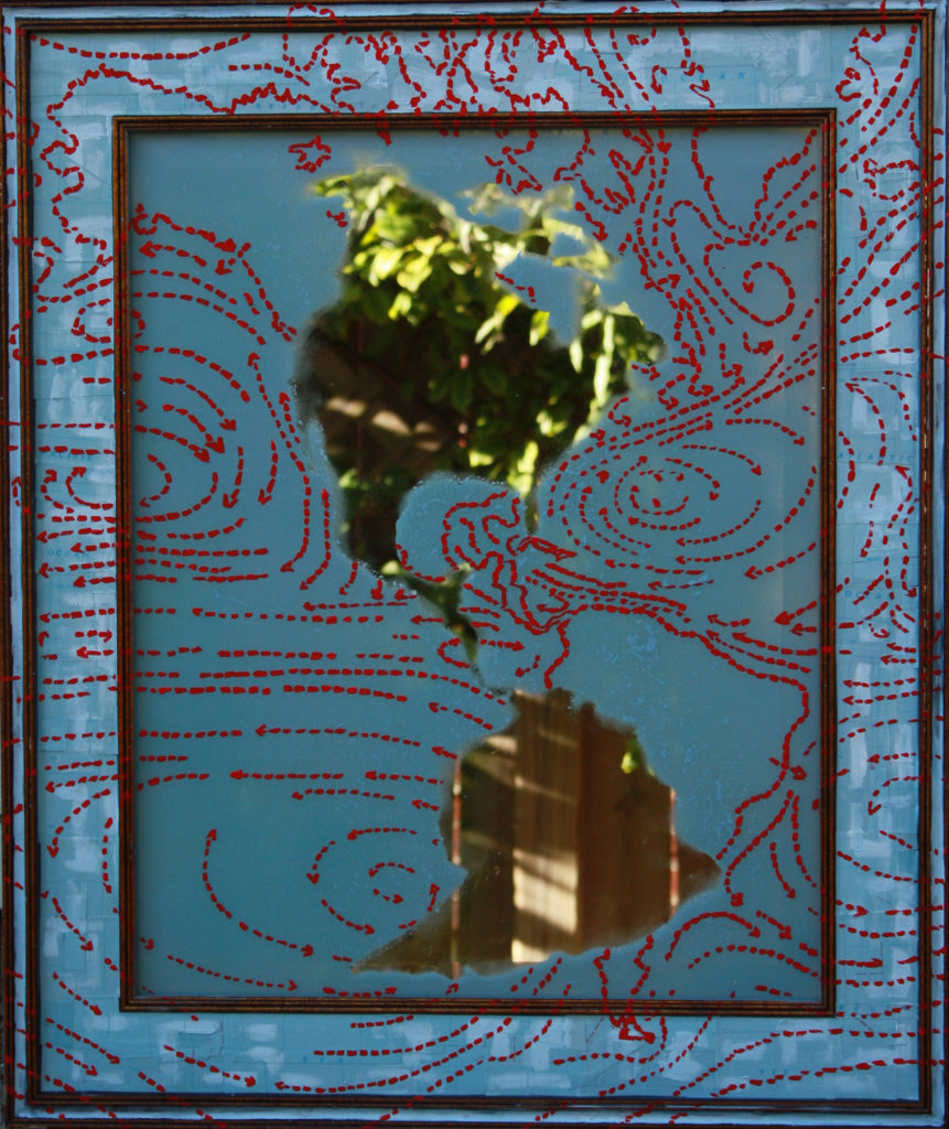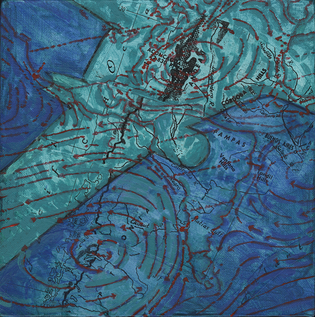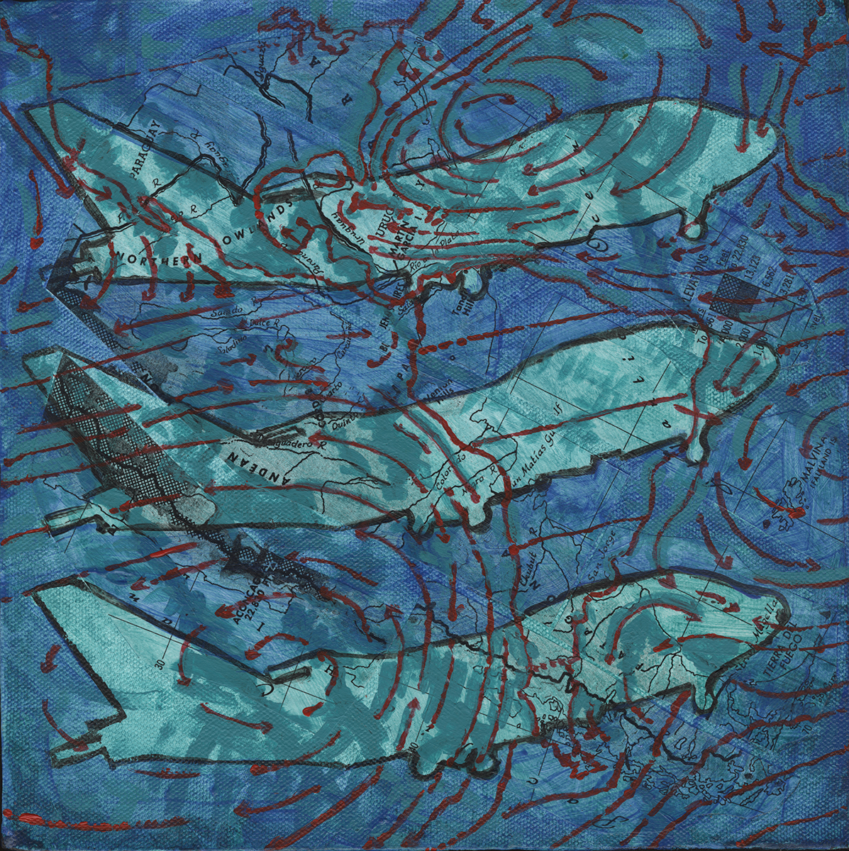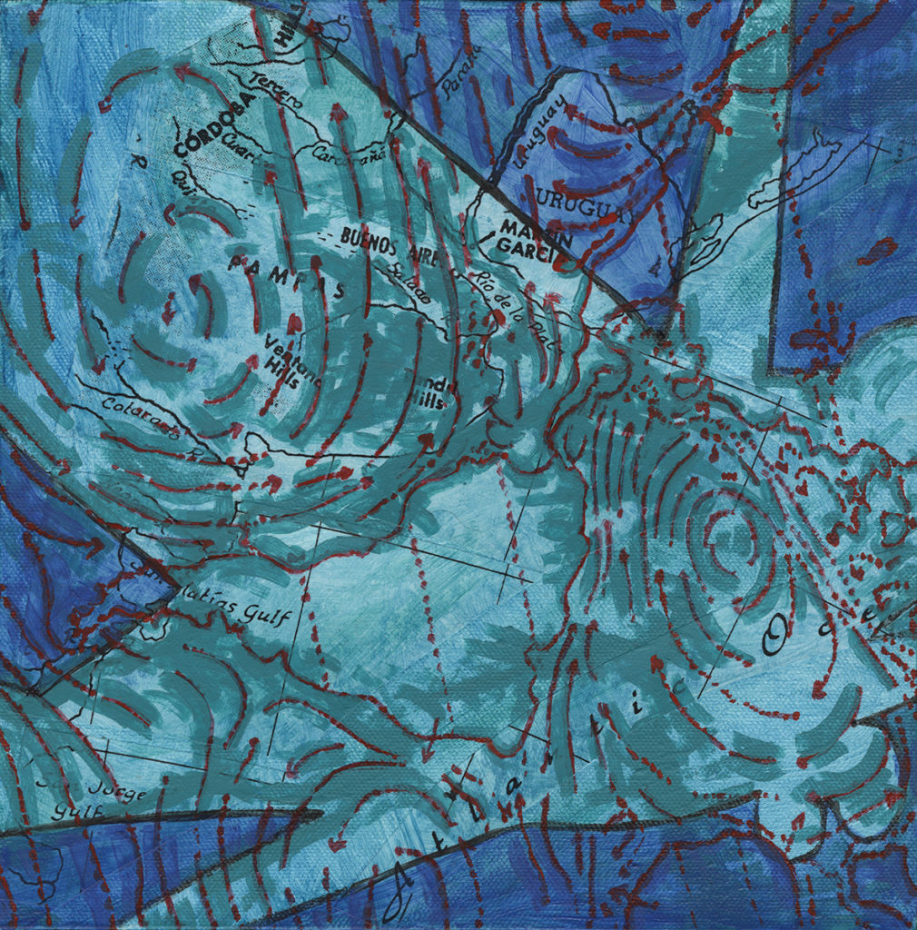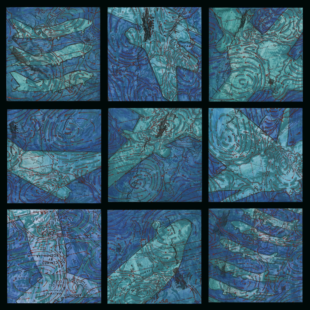 “Ponce de Leon… pulls from her international experience, musing on the disorientation travel can cause. The surfaces… are layers of collaged maps and diagrams.”