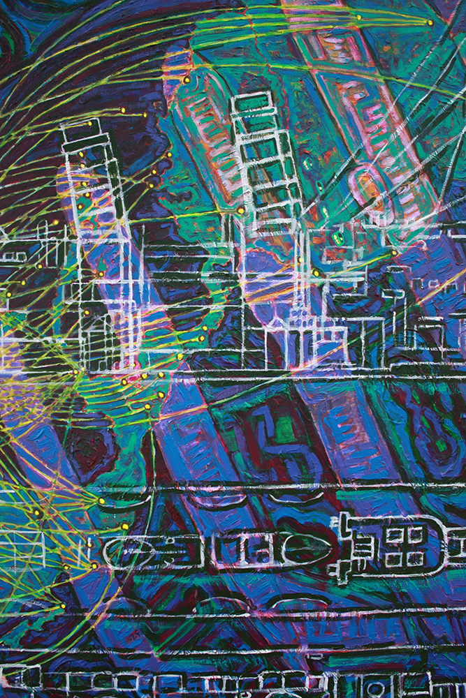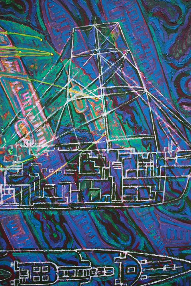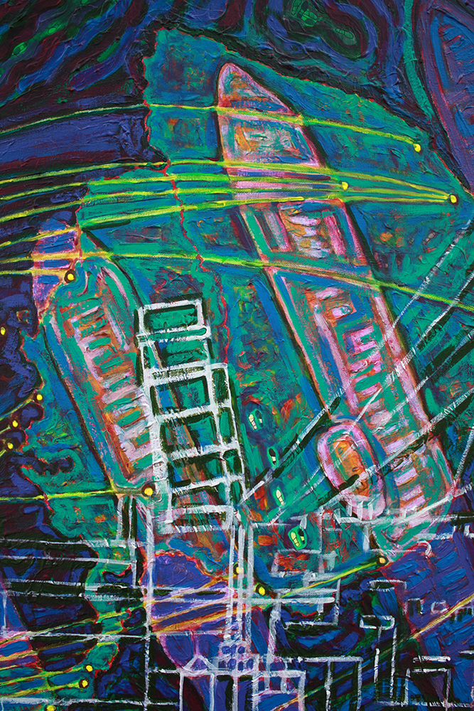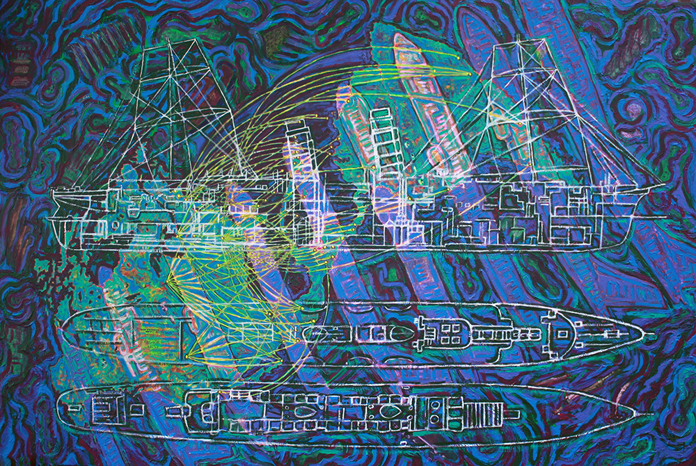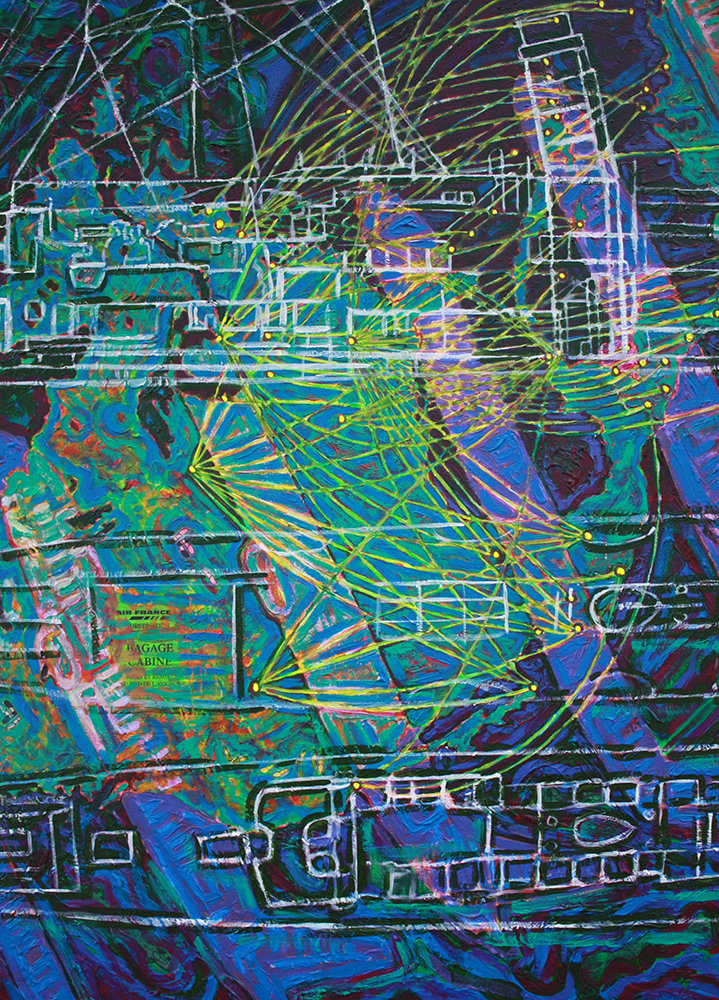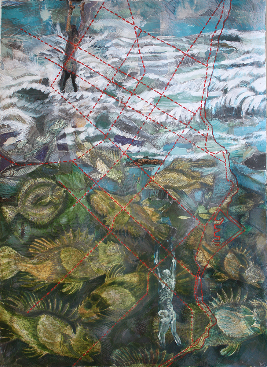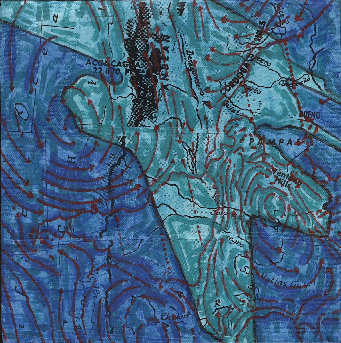 “Ponce de Leon… pulls from her international experience, musing on the disorientation travel can cause. The surfaces… are layers of collaged maps and diagrams.”
